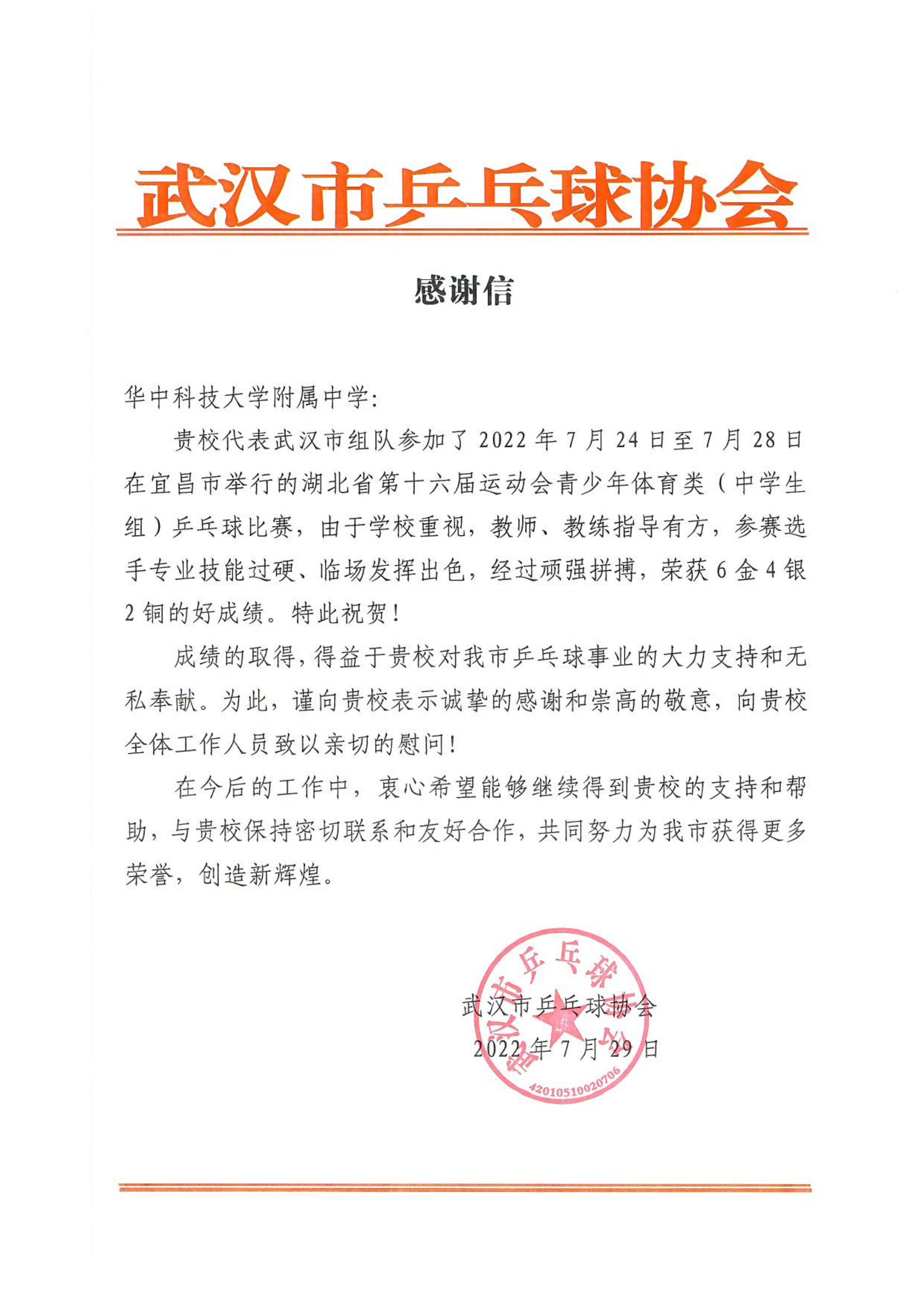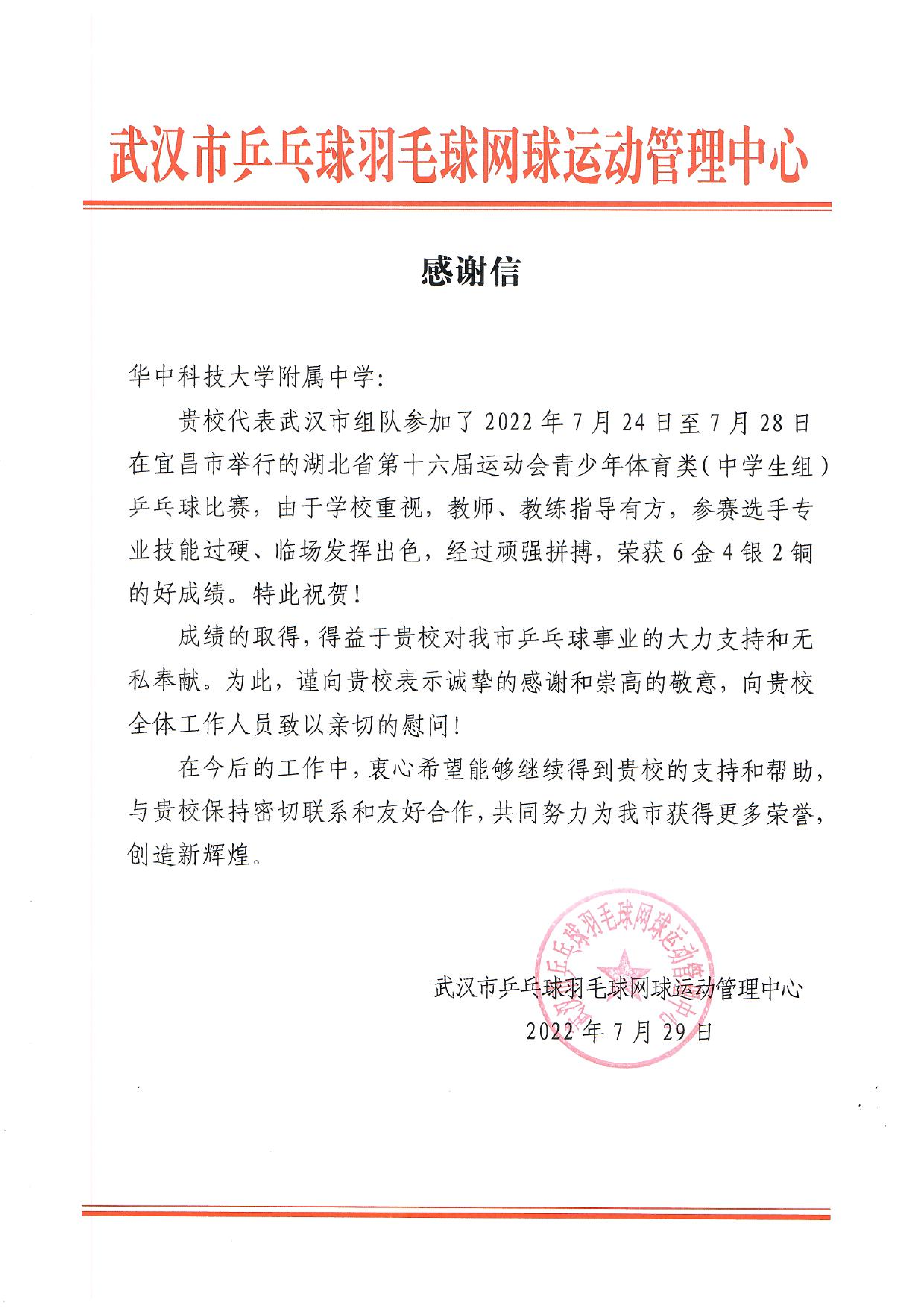7月23日至28日,湖北省第十六届运动会青少年体育类(中学生组)乒乓球比赛在宜昌市三峡中等专业学校职教园体育馆举行。经过为期4天的激烈角逐,华科附中领衔的武汉代表队在七个项目中斩获6金4银2铜,分别为男团、女团、男双、女双、混双、男单各一枚金牌,女单、混双、男双、女双各一枚银牌,男单、女单各一枚铜牌,并荣获“道德风尚奖”。